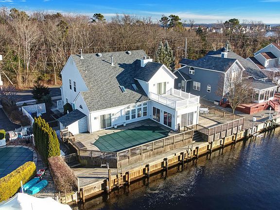 Situated amidst upscale homes, on one of the area's most beautiful streets; where natural preservation meets the waterfront, is this spectacular 2,850 sq ft home. The open concept floor plan lends well to entertaining. Off the foyer, the formal living room and dining room. The two story family room features a two sided wood-burning fireplace, shared with the center island kitchen that flows into the sun room, sure to be your favorite of rooms, with five sliding glass doors that open to the pool, deck & waterfront. First floor bedroom and full bath. Upstairs, three additional bedrooms. The master includes another two sided fireplace, enjoyed by both the sleeping area & the sitting room with its own private balcony overlooking the water. En Suite with separate shower & tub. Can close quick.
