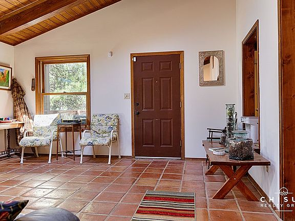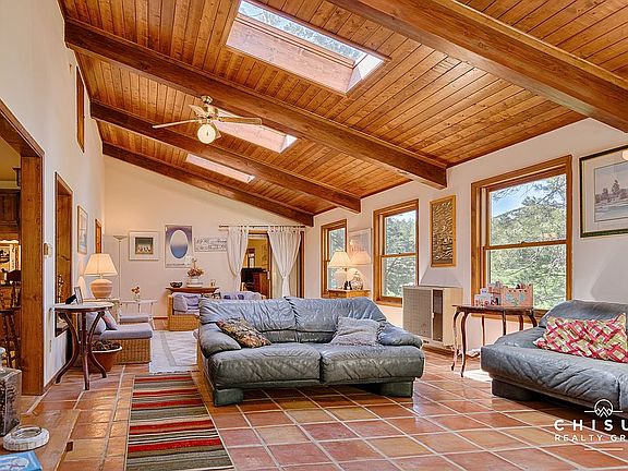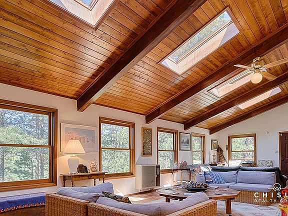 This spacious 3,300 square foot home might just be the ideal getaway or full-time home for a larger family looking for a more budget friendly option In Angel Fire. Featuring three living areas, five bed rooms and a two car garage, this home allows you to spread out. The large front deck is great for enjoying nature and the 1 acre plus lot is gently sloping and paved driveway offers more usable space to play. Upon entering the home, you'r e greeted with a bright and sunny sunroom with Saltillo floor tiles, multiple skylights, wood beams and tongue and groove wood ceiling. The living room features a wood burning fireplace surrounded by stone with the adjacent kitchen has title flooring and trey ceilings. You will also find the master bedroom with ensuite bathroom, another full bath, and two more bedrooms on the main level. The lower level has a separate living area with access to outdoors and multiple sleeping areas as well. This home is move-in ready and comes fully furnished.
