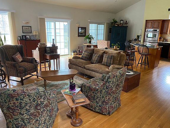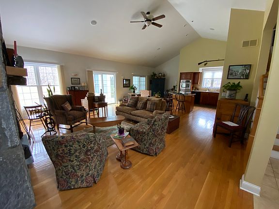 Unique to the market. Well maintained Ranch style home in an exquisite development. Adult community of single family individual custom built homes. Desirable layout with first floor living and loft/office/family room area located on 2nd story. Main floor offers open floor plan with first floor master suite. Main living level has large eat in kitchen with granite counters, stainless steel appliances, hardwood flooring and open to the living room with floor to ceiling (cathedral) stone fireplace. Formal dining room for family gatherings , and guest area with bedroom and full bathroom. There is a sun room/porch area enclosed with large windows to allow for much natural sunlight to shine in. Access to the out door deck is available from sun room area. The master bedroom suite has hardwood flooring, plenty of closet space and large master bathroom all located on the first floor. Upper level includes a family room area/Loft space, can be used for home office or guest bedroom. A very versatile space depending on your needs. There is a full basement as well for plenty of storage, accessible via the garage. A 2 car attached garage, and the finishing touches is a high end vinyl siding, cobblestone driveway and walk way. This development was designed with great care and thought, highlighting stone walls, mature plantings and professional landscaping, and privacy for each home. Maintenance for snow removal and lawn care is completed by the Fieldstone Homeowners association.