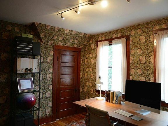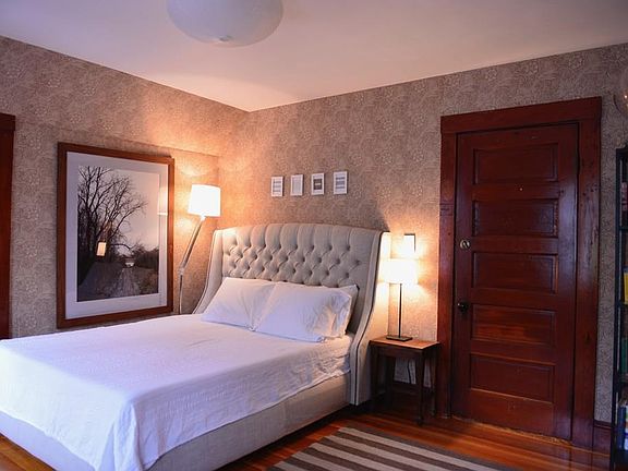 This classic 1910 colonial is bright, spacious, and beautifully renovated with contemporary luxury appliances, hardwood floors and original trim, doors, and windows throughout. Three bedrooms (one master, one larger and one smaller), 1 bath, separate living room with working fireplace, dining room with original restored built-in china cabinet from 1910. The two larger bedrooms have two extra-large closets each, the smaller bedroom one closet. Linen closet in upstairs hallway adds extra storage. Absolutely unique eat-in kitchen is newly renovated with tons of storage space, all soft close drawers, and handmade seeded glass cabinets, marble island, slate countertops, and high end European stainless steel appliances: gas range, refrigerator, dishwasher, and hood. Luxury bathroom with soaking tub and rain shower. House has been featured in the website 'Apartment Therapy' for its interior design. Large backyard with garden and patio, front porch with seating area, one private parking spot,
