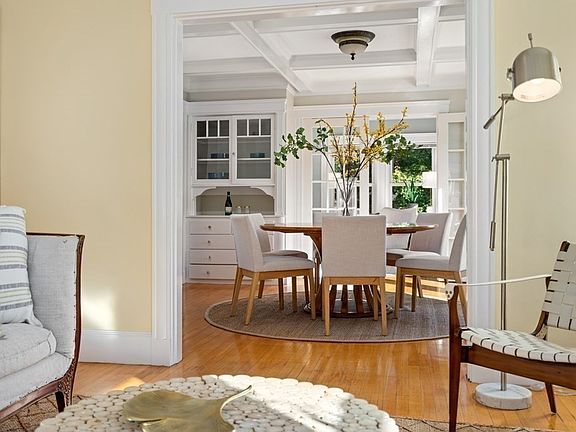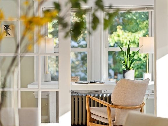 This beautiful sun-splashed seven room first floor condominium is perfectly sited on a tree lined street. Step into an inviting living room with beamed ceiling and fire-place, a formal dining room with coffered ceiling, built in cabinet and double French doors that open to the den/office, three generous bedrooms and an updated kitchen with S/S appliances and granite counter tops. Hardwood floors, central air, ample storage, garage parking, common yard and convenience to shops, restaurants, school and public transportation enhance this home.
