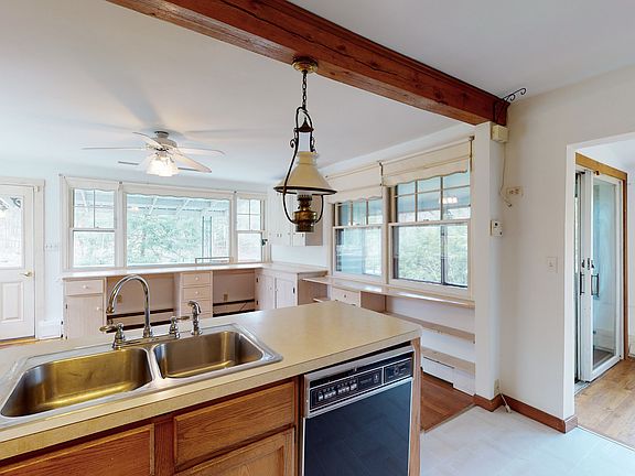 Your search is over for that great value home with stunning seasonal views of Candlewood Lake!! Great 3 bedroom, 2 bath rustic contemporary styled home with abundance of character in Candlewood Trails community with detached 2 car garage.Perfect time to enjoy the sprawling white sandy beach, boating and lake activities. Appreciate nature whether sitting on the covered front deck or enjoying the screened porch listen to the sounds of the babbling brook and lovely seasonal lake views. This 3 bedroom, 2 bath home has hardwood floors, open floor plan, large rooms, custom built in Amish shelving, exposed beams, skylights and walls of windows. Some great improvements include newer roof, double pane windows, oil fired furnace and hot water heater. Spacious living room hosts Antique Danish styled stove, custom wood built ins, exposed beams with abundance of natural light. Kitchen is open to the dining area & boasts lantern styled light, oak cabinets, laminate counters with double sink and shelved pantry. Bedrooms include ceiling fans, solid oak flooring, great closet space and even the master hosts a large sun drenched bay window. Truly a tranquil and serene setting great place for the gardener or lake lover. Full unfinished lower level with laundry and walk-out. Some new cosmetic updates will make this the home you will love! Private Lake Community has sandy white beach, clubhouse & boat slips available with additional fee. Interior was painted, exterior needs paint.