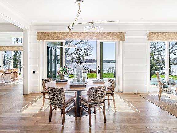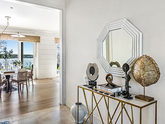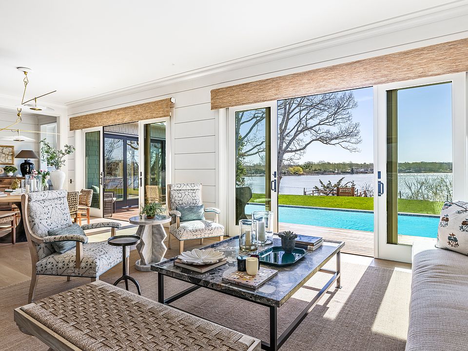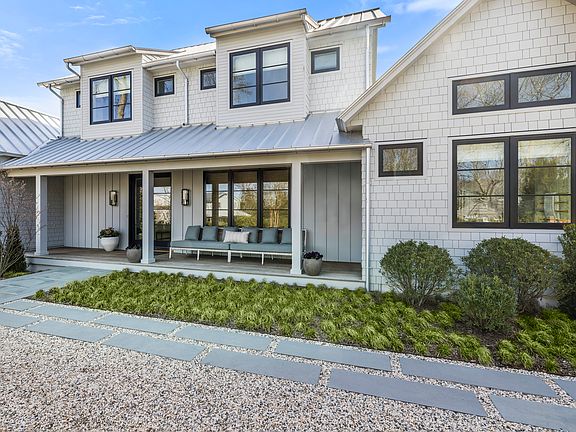 Completed in 2024, this breathtaking waterfront home is set on 0.65 acres and features 5,300 square feet of living space across three levels in the heart of Sag Harbor Village. This designer home offers an unparalleled living experience, boasting 5 bedrooms, 5 full and 1 half bathrooms, a heated gunite pool, a gym, a dock, and 145' of frontage. Masterfully curated with top-of-the-line materials and finishes, the interior is marked by its custom panelled walls, marble bathrooms, 10ft+ ceilings, and fixtures from Waterworks and Allied Maker. The open kitchen features top-of-the-range Sub-Zero and Wolf appliances, a built-in custom hood, and panoramic water views that continue throughout the living room and dining room. The main-level primary suite is flooded with natural light and boasts two walk-in closets as well as a spa-like primary bathroom with solid Italian marble and radiant floor heating throughout, as well as a large soaking tub and two private toilets. The main level also features a media room/den, a mudroom with laundry and a wine fridge, a drinks bar, an entry closet, and a powder room. The upper-level features three king-sized bedrooms with en-suite bathrooms and custom-built closets, another laundry, two linen closets, and a walk-out deck with seating and incredible views of Upper Sag Harbor Cove. The finished walk-out lower level features an additional bedroom and bathroom, a gym, a multipurpose playroom/den with a built-in kitchenette, and an office. For boat enthusiasts, a private dock and unparalleled access to Sag Harbor Bay awaits. For those who want to enjoy Sag Harbor Village, the home is a close distance to the marina, art galleries, and best-in-class restaurants.