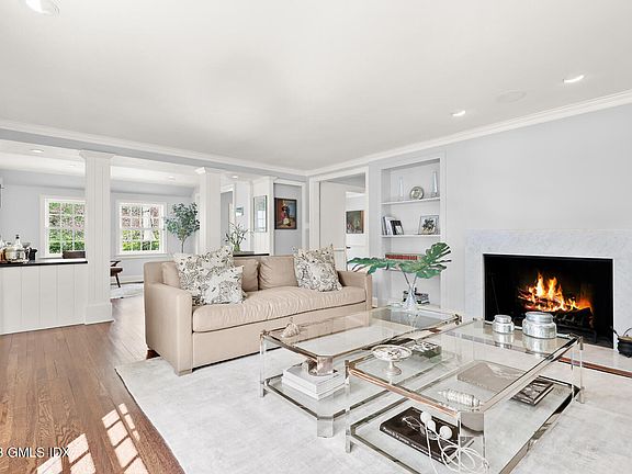 Chic modern design blends with exquisite 1939 architectural details in this stunning four-bedroom home set on .49 manicured acre on a desirable Riverside road near sidewalks to village, schools and park. Open floor plan showcases formal rooms, ideal for entertaining, with dining room, lounge and fireplace in living room. Casual wing, part of 2008 renovation/expansion, boasts family room with coffered ceiling, fireplace and French doors to fabulous sunporch. Concrete-clad kitchen with breakfast nook, stone terrace access; mudroom, two offices and half bath round out this main level. Second floor offers primary suite with fireplace, walk-in closets and luxurious bath affording radiant heated floors; three-bedrooms, two full baths, laundry and gym/playroom. With detached two-car garage.