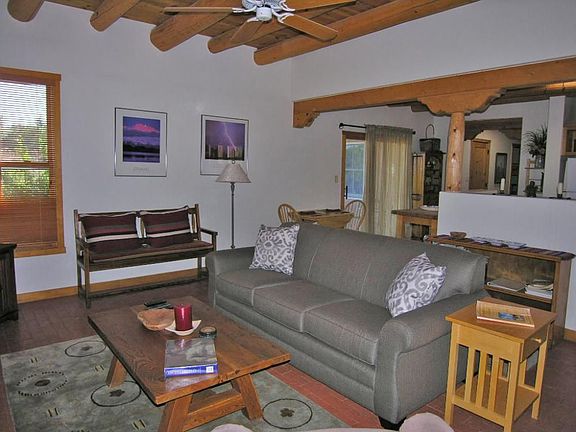 Enter into the living room with light streaming in from all directions. Enjoy the wonderful Santa Fe furnishings while you watch TV, keep cozy by the wood burning fireplace or entertain guests. The fully outfitted kitchen opens to the living room and dining area; gas cooking, dishwasher, microwave and many choices of dishes and pots and pans. Step onto the deck from the kitchen to a robin's egg blue porch swing with table and chairs for outdoor entertaining. The master bedroom walls are adorned with southwestern wall hangings, and has a queen bed, walk in closet and wonderful southern exposure. There is an adjoining bathroom with fantastic Mexican tile both colorful and welcoming for long soaks in the jetted tub while watching the sun set over the Jemez mountains. The guest bedroom has two twin beds with lots of books, walk in closet and precious quilts of mixed desert-country flair. Adorable! Twelve month lease preferred. Fully Furnished Enter into the living room with light streaming in from all directions. Enjoy the wonderful Santa Fe furnishings while you watch TV, keep cozy by the wood burning fireplace or entertain guests. The fully outfitted kitchen opens to the living room and dining area; gas cooking, dishwasher, microwave and many choices of dishes and pots and pans. Step onto the deck from the kitchen to a robin's egg blue porch swing with table and chairs for outdoor entertaining. The master bedroom walls are adorned with southwestern wall hangings, and has a queen bed, walk in closet and wonderful southern exposure. There is an adjoining bathroom with fantastic Mexican tile both colorful and welcoming for long soaks in the jetted tub while watching the sun set over the Jemez mountains. The guest bedroom has two twin beds with lots of books, walk in closet and precious quilts of mixed desert-country flair. Adorable!