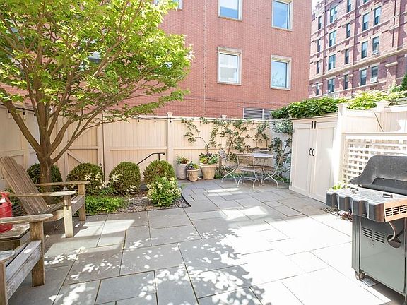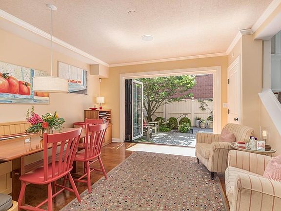 Sophisticated Single Family Townhouse on coveted Cumston St., 3 beds + office, 2.5 baths & 1 garage space (2nd space available). Enter the 1st floor to the inviting eat in kitchen & informal living/dining room w/ a glass NanaWall(tm) opening to the professionally landscaped bluestone patio w/ irrigation and lighting. The kitchen w/ cherry cabinets, stainless steel appliances, granite counters & stone backsplash is complimented by a charming dining area w/ a built in banquette w/ storage. A 1/2 bath is on this floor. The 2nd floor is a double parlor w/ formal living & dining areas as well as a home office through french doors. The gas fireplace is flanked by custom built-ins. The 3rd floor has 2 bedrooms, updated bath & linen closet. The top floor is the primary bedroom suite w/ custom built-ins & walk in closet, updated bathroom w/ radiant heated floors, double vanity, walk in shower, separate w/c & laundry.