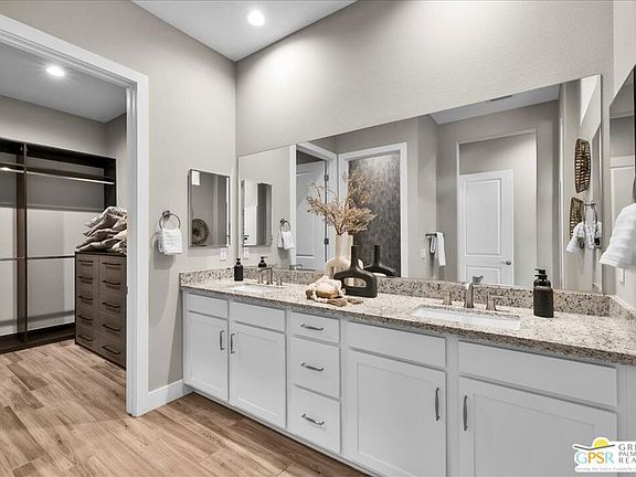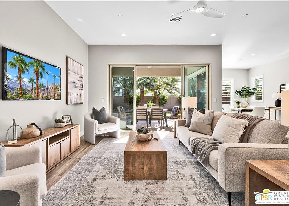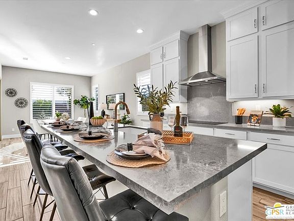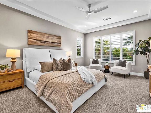 Elegant Desert Retreat in Del Webb Rancho Mirage - Step into refined desert living with this stunning Phase 4, Expanded Plan 7 Refuge featuring a timeless Prairie elevation with Leased Solar ($111 Per Mo). From the moment you enter, you're greeted by elegant tray ceilings in the round foyer and down the entry hall, accented by designer-selected wallpaper and rich wood-look plank tile flooring that sets a tone of sophistication throughout. This highly upgraded residence offers exceptional comfort and style, featuring plush upgraded carpet, 5 1/2" baseboards, and high-end ceiling fans in every room. The versatile floorplan includes dual ensuite bedrooms plus a powder room and a flex space with tray ceiling and walk-in closet - ideal as a media room, den, or easily converted third bedroom. At the heart of the home, the open-concept kitchen flows seamlessly into the dining and living areas. A chef's delight, it boasts quartz countertops, upgraded 42" upper cabinets and jewel cabinets with crown molding, soft-close drawers, induction cooktop, stainless appliances, and a large island with ample seating. The living area showcases an upgraded wet bar with a high-end wine fridge and dual sliding glass doors that open to the covered patio, creating effortless indoor-outdoor living. The primary suite is a serene sanctuary featuring tray ceilings, abundant natural light, and views of the lush backyard. The ensuite bath is a spa-worthy escape with a zero-threshold rain shower, dual vanities topped with natural granite, and a custom walk-in closet. The secondary suite, located on the opposite end of the home for added privacy, is equally impressive - offering San Jacinto Mountain views, a built-in desk and closet system, and full bathroom with granite countertops, and designer wallpaper accents. Additional highlights include a thoughtfully designed mudroom with a built-in shoe station and coat hooks, a spacious laundry room with cabinetry, granite counters, utility sink, and skylight. The fully finished, climate-controlled three-car garage features sealed floors, a 220V EV outlet, dedicated workshop space with upgraded outlet package, and remote-controlled HVAC for year-round comfort. The backyard is a private oasis, complete with real grass, natural stone walkways, citrus trees, ambient lighting, and peekaboo mountain views. A covered patio with remote-controlled zipper shade and a full rain gutter system add comfort and practicality to this outdoor retreat. Located near the clubhouse within the prestigious guard-gated 55+ community of Del Webb Rancho Mirage, residents enjoy access to world-class amenities including pools, spa, tennis and pickleball courts, fitness center, and a vibrant social scene. Experience the perfect balance of elegance, comfort, and resort-style living - this home truly stands apart.