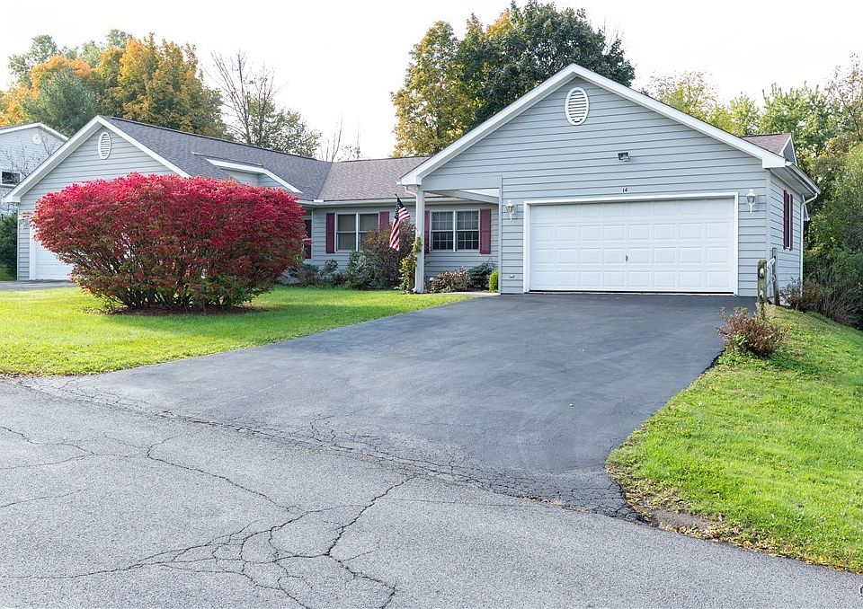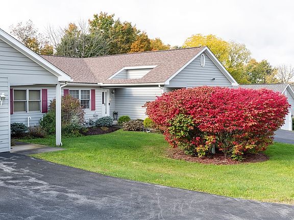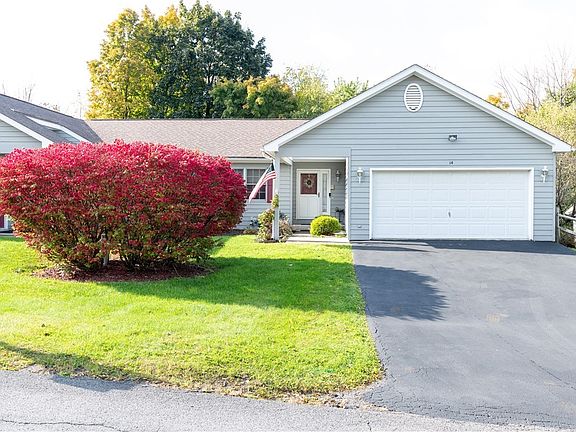 Rarely for sale townhouse in New Hartford. No HOA! Main level has 2 bedrooms and 2 full baths. Cathedral ceiling in the Living Room/Family Room/Dining Room with 2 large skylights. Primary bedroom has its own full bathroom and walk-out to porch. 1st floor laundry. Lower level has a cozy gas fireplace, a full bathroom, and a spacious bedroom with plenty of living space. Even a kitchenette for those who want the apartment lifestyle. Screened in porches on both levels. 2-stall attached garage. Central air and many amenities. Additional insulation added this year. Garbage compactor inoperable. Roof warranty dated 10/2020.