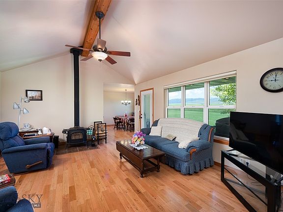 This 3 bedroom, 2 bathroom home is located in the quiet neighborhood of Hollowtop Vista, just outside of Harrison, Montana. The home is all single-level living, with a bonus room above the garage. The 1-acre property backs up to a large parcel of irrigated hay ground that climbs to meet the snow-covered peaks of the Tobacco Root Mountains. From the great room and back patio, there are unobstructed views of Hollowtop Mountain and the other craggy peaks of the range.