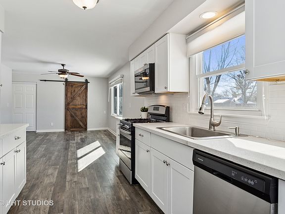 Nestled on .27 acres this updated ranch in Boulder Hill of Montgomery offers an open floor plan, 3 bedrooms, 1 1/2 bath and two car attached garage. District 308 schools! New luxury vinyl plank flooring in main living areas and hallway (2023) and fresh neutral paint throughout (2023). Generously sized dining room able to accommodate large farmhouse table and living room floorplan perfect for that cozy sectional. Sparkling white shaker cabinets (2017), Quartzite countertops (2017), all stainless steel appliances (2017), breakfast area and shiplap accent wall in breakfast area. All bedrooms have ceiling fans with overhead lighting. Primary bedroom offers dual closets and attached half bath. Barn doors leading into spacious laundry room with room for full size washer/dryer, shelving for storage and access to backyard. Fully fenced backyard with tons of space for entertaining and enjoying those sunny days ahead! Updates: roof (2017), vinyl windows (2017) and vinyl siding (2017). Serving into Oswego High School! Walk to Civic Center and easy access to parks, shopping and restaurants. Welcome home!