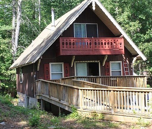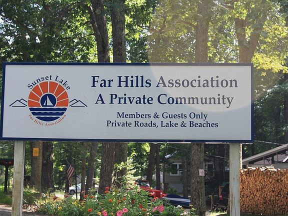 Bring your imagination when you come to view this Chalet-Style home with over an acre of private wooded land. Imagine the possibilities this Open concept home could bring. Beautiful original beams throughout, large open basement with room to expand. Pellet Stove will remain with the house. Located on the back side of Sunset Lake. Enjoy all the great privileges that come with living on this lake, swimming, boating, skating, etc. (Association fee covers your water, roads paving and plowing as well as use of the Lake.) Recent work to foundation. Visit farhillsassociation for more information on rules and regulations.