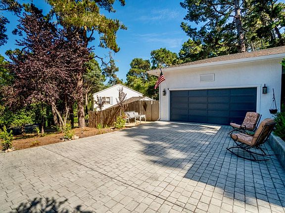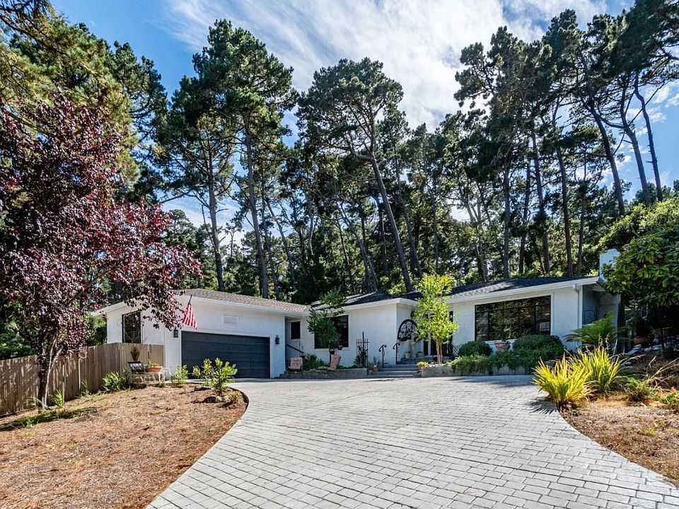 Remodeled in 2017, this luxury turnkey property sits proudly on a coveted cul-de-sac in Monterey. The single-story ranch layout is placed perfectly on an expansive 1/4 acre lot, tucked against the Pebble Beach greenbelt, with spacious driveway courtyard providing ample parking for guests. High-end finishes and designer touches include vaulted ceilings, exposed wood beams, hidden accent lighting, wide-plank wood flooring, split-faced marble fireplace, custom cabinetry with dovetail drawers, granite counters, stainless appliances including 6-burner Thermador cooktop, wine bar, and thoughtful accents like louver barn door elegantly partitioning in-house laundry. 5 skylights and large windows with motorized blinds bathe the spaces in natural light. 2 sets of glass doors lead to private patios and gardens. Important aspects are addressed: new electrical, furnace, water heater, insulation (even sound-proofing between master bed/bath) and so much more. Just minutes to downtown and the ocean.