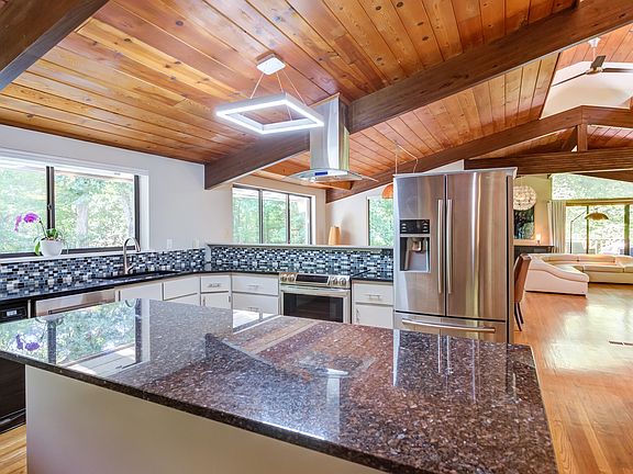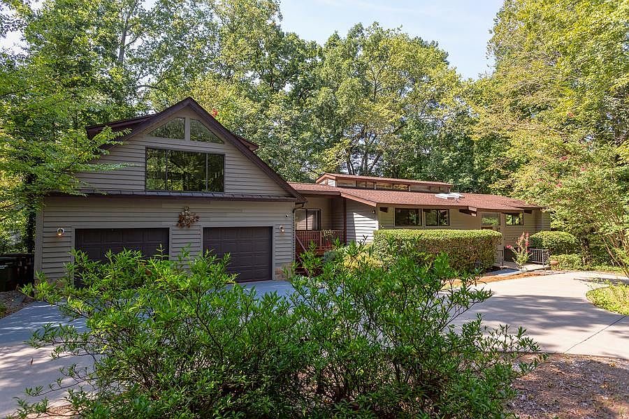 Open, Mid-Century Modernist with sweeping views and tons of natural light. Large, open kitchen connects to Dining Room and spacious Family/Living Room with views to tri-level decking. Large bonus room / media room over the garage. Main-level primary bedroom and remodeled bath. Main level 2nd full bath. Lower-level with 2 bedrooms, full bath, den, office and fabulous Four Season Room with its own HVAC. Multi-tier deck/patio and hot tub. Beautiful, wooded, fenced back yard with Gold Fish Pond. Extremely well-maintained over the years. All three HVAC systems newer. Walking distance to Montessori School. Minutes to Duke, Chapel Hill and RTP.