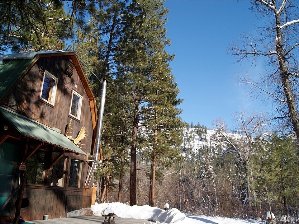 Shy 1/2 acre lot on the edge of wildness near Winthrop, Washington! 816 SF 2 bed 2 bath cabin. Lot has treed rich riparian area with incredible bird watching! Solid wood floors. Master Bedroom has wood floor. Guest bedroom is carpeted. All appliances included.Electric heat and wood stove fireplace keep cabin toasty warm through Winter.Two outside decks.Open mountain views. Must see! Shown by appointment only with 12-24 hr notice.Tenant rights.