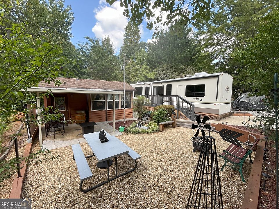 Looking for a serene Mountain Getaway? Gated community nestled in the North Ga Mountains with Amenities - Pool, Pavilion, Clubhouse, and lots of planned activities! Cottage by Cedar Creek + Cabin. This 2014 Cottage is loaded and decorator gorgeous! The Kitchen features a solid surface center island with dishwasher, double sink, gas stove, microwave, full-size stainless-steel refrigerator, bar with a hideaway bread box and a central vacuum! Warm up at the fireplace on the sleeper sofa or recliner as you enjoy the tv that can disappear into the cabinetry. Custom decorator valances with drapes/ sunscreens throughout! A roomy bath with seated shower to relax! The owner's suite has a king bed, big mirrored closet, chest, plus washer/dryer hookups! Let's not forget the motorized awning that shades the walk to your private courtyard and a covered porch connected to the cabin where you will enjoy spending time! The cabin includes a kitchenette with stove, sink, coffee bar, and full bath with washer/dryer, and a huge tv that makes it perfect for a mancave or your guest. Recently replaced in 2021 is a wall HVAC and water heater. You'll have 2 storage containers here too! Don't delay! This one is a jewel! Plus it is almost fall and time for enjoying the gorgeous north Ga mountains! Located minutes to Cleveland, Dahlonega, Blairsville, Shop, Dine, Fish, Hike! Enjoy Vineyards and more! A great place to make a lifetime of memories! A seasonal living vacation community, so no full time living available. Listing agents own properties in this park, so call for more info, or to see.