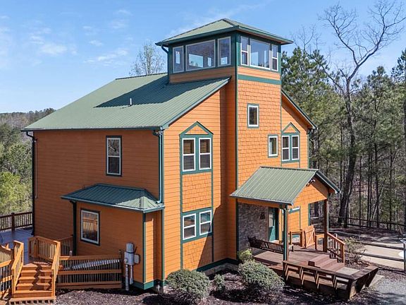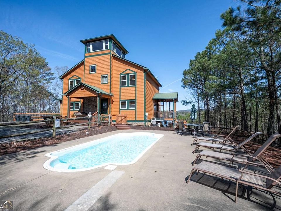 This spacious, 3-bedroom, 4-bath luxury cabin is the ultimate retreat, offering breathtaking year-round mountain views. Perfect for families or large groups, the home features an open living concept with soaring high ceilings that enhance the sense of space and light. The main floor boasts a master bedroom with an en-suite bath, as well as a convenient laundry room. Upstairs, you'll find two additional bedrooms, with shared bath, and a bonus oversized loft ideal for additional relaxation or entertainment. The home includes a rooftop lookout tower, offering unparalleled views of the surrounding mountains, and a heated pool and firepit for year-round enjoyment. Inside, the rustic yet luxurious interior is equipped with upgraded features, providing comfort and elegance throughout. The fully finished basement is an entertainer's dream, complete with a pool table, wet bar, fireplace, and yet another master bedroom and bath, offering ample privacy for guests. All in a private upscale community with gated access. Outdoor enthusiasts will appreciate the direct access to hiking and fishing opportunities, with deeded access to the pristine 3,200-acre Carter's Lake, making this the perfect destination for both relaxation and adventure.