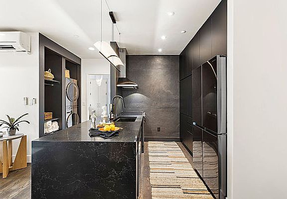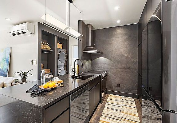 Modern, designer renovated 2Bed/2Bath open floorplan with dining room, brand new kitchen featuring floor-to-ceiling cabinets, custom granite countertops and top-line appliances, laundry nook with full sized washer/dryer, mini-split AC/turbo heat in each room, primary bedroom with king bed and ensuite bathroom with double vanity sink and large walk-in shower and luxury BioBidet automatic bidet with heated seats and self-flush toilet, second bedroom with queen bed and desk, guest bathroom features deep-soak tub, auto/Alexa enabled blackout roller shades in bdrms and refinished hardwood floors, electric fireplace in living space, large sun-filled windows in each room. Building features rooftop garden, lobby, enclosed child playspace, mailroom, bicycle room and more. Parking: Enclosed (temperature controlled) designated garage parking spot included. Internet: High-speed Google Fiber included. No fee rental. Pet-friendly. Available fully furnished or unfurnished starting July 1, 2023.