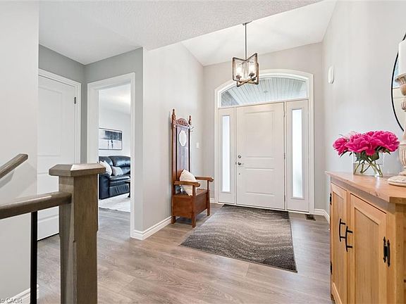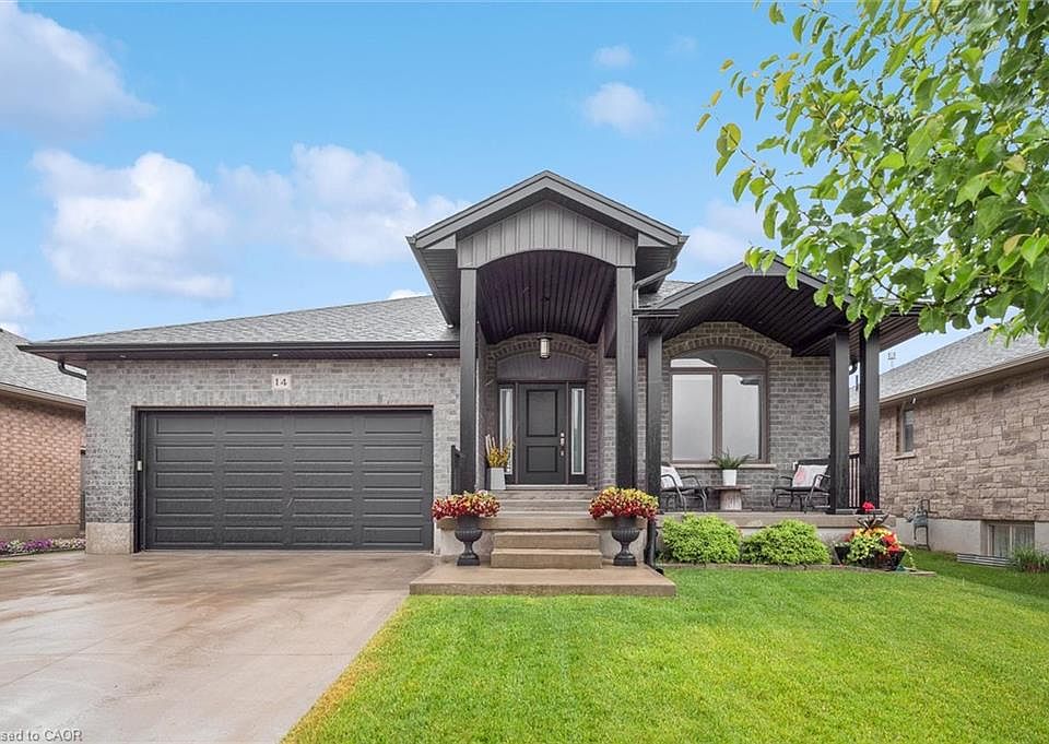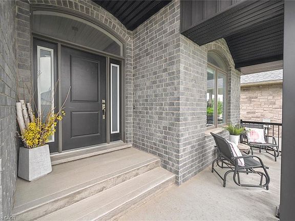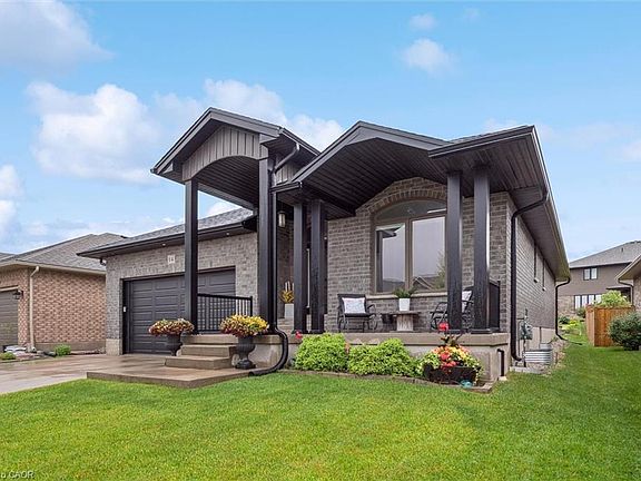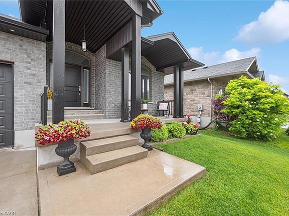 Welcome to this stunning 6-year-old all-brick bungalow with double car garage, located on an established and quiet street in the north end of Fergus. Featuring a pristine double concrete driveway and a breezy covered front porch, this home offers great curb appeal and a warm welcome. Step inside to a spacious front entrance with soaring ceilings and a carpet-free interior, large windows throughout flood the home with natural light and offer picturesque views. The inviting living room features a vaulted ceiling and a cozy fireplace, open to the kitchen and dining area perfect for entertaining. The kitchen boasts a large stone island ideal for casual dining, abundant cabinetry, and excellent functionality. The adjoining dining area opens to a beautifully finished covered patio with stamped concrete ideal for outdoor meals and relaxation. A large mudroom/laundry room combo is conveniently located just off the kitchen, offering direct access to the garage and featuring an impressive 5x5 walk-in pantry. The main level offers two spacious bedrooms, each with walk-in closets, and two well-appointed bathrooms. The professionally finished lower level boasts 9-foot ceilings, a third bedroom, a full bathroom, and a large family room complete with a stylish wet bar ideal for gatherings or movie nights. Two additional unfinished rooms provide ample storage or future development potential, along with a generous cold room. Call today to view this exceptional home.