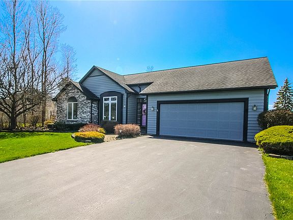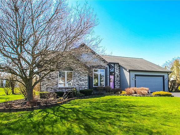 Beautiful ranch set on a peaceful cul de sac with Churchville Chili Schools. A paver walkway leads you inside to the spacious entryway. The open floor plan offers a large living room with vaulted ceilings and natural light pouring in. The eat in kitchen will make all your cooking a breeze with granite counters, stainless appliances, hardwood floors and an island with seating. Down the hall you will find 3 bedrooms and 2 full baths including a primary suite with a no step shower. For added convenience you will also find a 1st floor laundry and a half bath in the 12 course basement. Outside you will find an entertainer's dream! The huge deck with screened gazebo and retractable Durasol awning overlooks the inground pool. The 2 car attached garage and a shed give you endless outdoor storage. All of this plus steps away from walking paths and ponds. Come fall in love with this amazing home today! Delayed negotiations until 4/23/24 at 12pm.