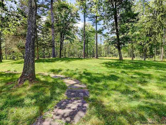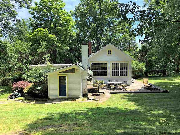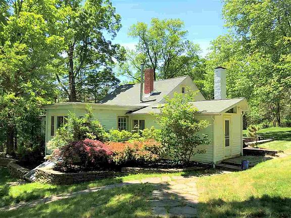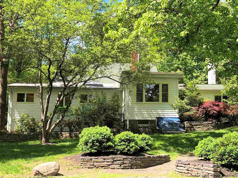 1925 BYRDCLIFFE COTTAGE and more ... in a perfect walk-to-town location. Completely private in a world of its own--tucked away on 2.5 pastoral acres woven with bluestone pathways and views of Mt. Guardian. This home typifies 1920s Woodstock when artists flocked to this mountain community to create... as they still do. Enter the rustic, light-filled eat-in kitchen with its reading nook and cozy woodstove. A small sunny bedroom--en suite with a wall of shelving for collections or toys--has a charming Dutch door to the outside. A spacious second full bath with a deep soaking tub adjoins the master bedroom at the end of the hallway. The Great Room, with soaring vaulted ceiling and chestnut wood beams, was built with wood from indigenous trees harvested on the property. Bookcase-lined walls and creative storage cabinetry were crafted by a local artisan. With its north-facing artist's window overlooking the lush meadow and woods beyond, this home is an original Byrdcliffe artist's studio, once owned by a well-known Woodstock ceramicist. The brick fireplace and 2 Dutch doors that lead to private stone patios with original stone barbeque add to the timeless charm. The Dining "Room" feels separate, yet is part of the Great Room, offering an open setting for entertaining. A stairway leads to a third bedroom/office that overlooks the landscape. In 2011 a separate 535-sq.-ft. 1-bedroom, 1 bath accessory apartment/art studio with an amazing 30x24-foot garage was built under the design of Woodstock architect Les Walker. This efficient space is equipped with a mini-kitchen and sliders that open to a deck for easy escape to the outdoors, where a stone walkway leads to the main house. The contempo feel of this self-contained unit is enhanced by the customized (built-into-the-walls) 7.1 multimedia audiovisual system. In recent years, the owner has carved out a gorgeous park-like property that features a variety of specimen trees, extensive bluestone patios (with installed outdoor sound speakers) and walkways. An inviting circular driveway surrounding a flowering Yoshina cherry tree provides a dramatic welcome to all who visit this special place.