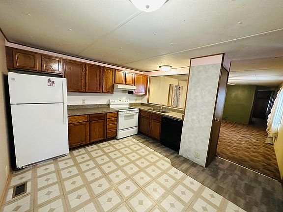 This manufactured home features large living room with the open eat-in kitchen, kitchen appliances are included, large primary bedroom with bathroom. Additional bedroom with bonus room and 2nd bathroom. On the exterior you will find a nice sized covered deck, attached garage and storage shed. Buyer must apply and be approved through Kingswood. Lot rent $370.