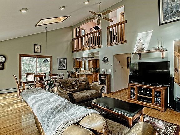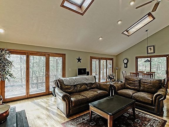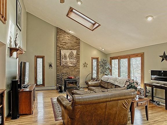 Discover sanctuary in this stylish 3 bed, 2 full bath contemporary home, nestled in dense woodlands, situated on 1.65 acres of private land. Live in the atmosphere of a lodge getaway vacation as nature complements comfort. The open architecture complements the outdoors w lots of picturesque windows, vaulted ceilings, & loft area overlooking the expansive main floor. The coziness of the wood stove & exposed brick hearth invites family & guests for special occasions. Living room, sunroom & dining area adjacent to updated kitchen w granite tops, peninsula, s.s. appliances & built-in wine glass rack. 2 bedrooms & full bath on main floor. Upstairs open loft space leads to master suite offering spacious master bath w granite topped double sink vanity, a luxurious walk-in shower, a soaking tub w waterfall faucet. Also adjacent is home office & extra walk-in closets w custom shelving. Family & game rooms in bsmt. Yard features rear deck wired for future hot tub & sizeable storage shed.