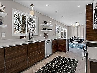 This handsome mid-century modern ranch on a quiet cul-de-sac has been given a distinctive new look that highlights its mid-century design. Inside you'll find a large, beautiful & bright new kitchen w/ quartz counters and SS appliances, plus 2 stylishly updated full bathrooms. The cheerful dining area has a great view of the new deck, fire pit & backyard while the living area has vaulted ceilings & a cozy gas fireplace with new tile surround All utilities are included in the rent
