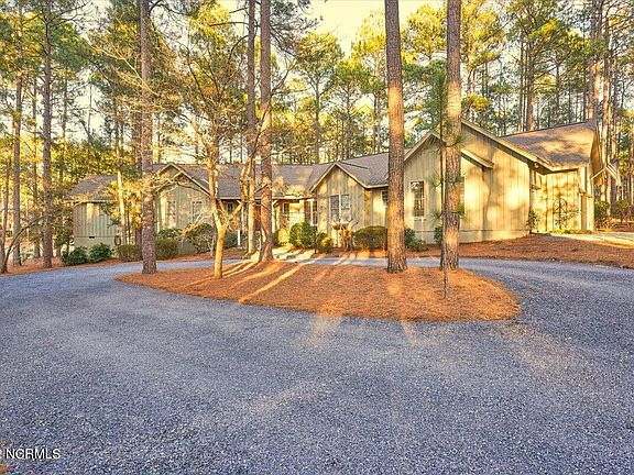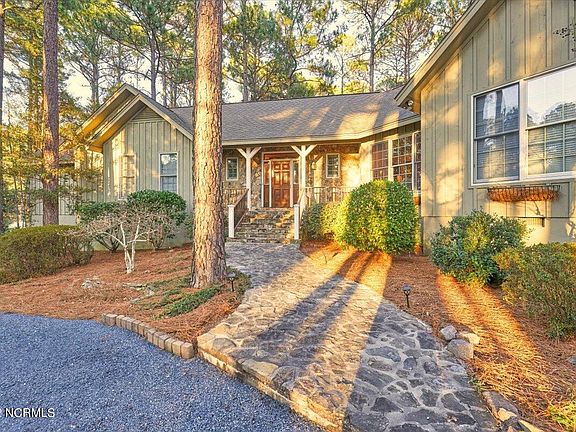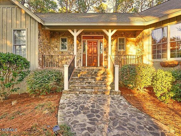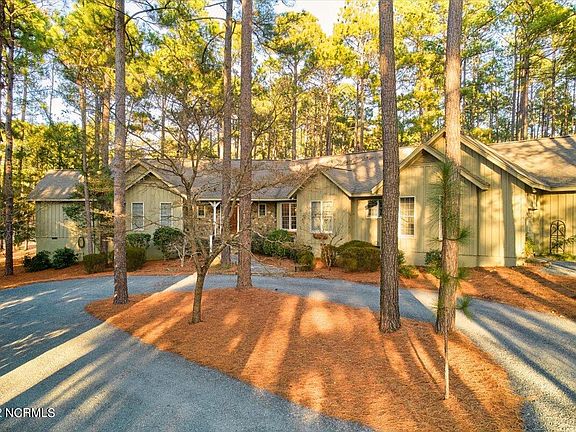 Welcome home to 14 Linton Court, Pinehurst. This unique and immaculately kept home filled with amenities and views brings the warmth and comfort of a mountain retreat to the Sandhills. This rare find is situated on and overlooks the beautifully manicured Magnolia golf course in the highly sought after gated Pinewild golf community. Convenience and functionality are incorporated in this 3-bedroom 2.5 bath ranch style home with an office. The interior is appointed with real wood trim, doors, and hardwood floors throughout with new carpet in the guest bedrooms. They truly do not build them like this anymore. This home has custom hardwood cabinetry in the kitchen and features a generous island with prep sink, stainless appliances, double ovens, and a bar. Retreat to the covered porch enclosed with durable EZE Breeze® screen windows and marvel at the second green and third tee of the Magnolia course. Want more fresh air and sunshine, escape to the unobstructed views of your wooden deck and enjoy the serenity of tall pines, playful squirrels and the sounds of nature. Say goodbye to traffic noise and distractions with the seclusion of Cul-de-sac living. Keep the tools, containers, and vehicles safe from the elements in your two-car garage with golf cart storage. Invite your friends for the evening with plenty of parking on your circular driveway. Welcome them into your home over the stone front porch. Dazzle them with plantation shutters, souring vaulted ceilings, exposed rafter beams, rustic chandelier, and a stone clad wood burning fireplace. Entertain or relax in the open kitchen, dining, or living room. Handle household and business affairs in the private office with French door access, where you can maintain your sophisticated library of novels and professional references in the custom built-in shelving and cabinetry. Finally, after a long day rest and slumber await in your French door accessible owner's suite featuring owner's suite featuring 3 walking closets and attached bath with a garden tub and oversized shower. Your new home awaits your arrival!
