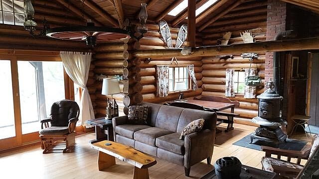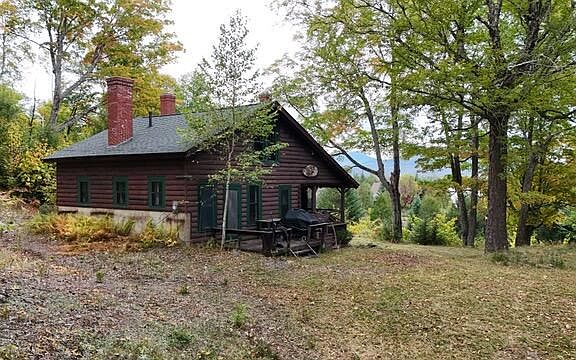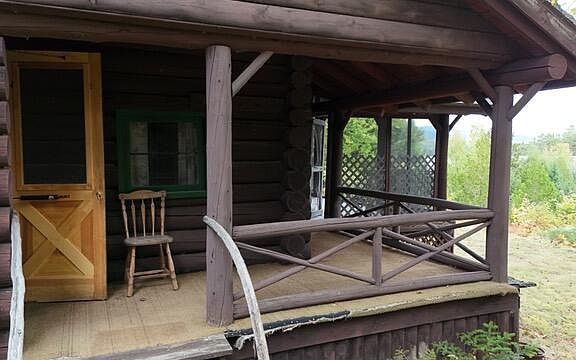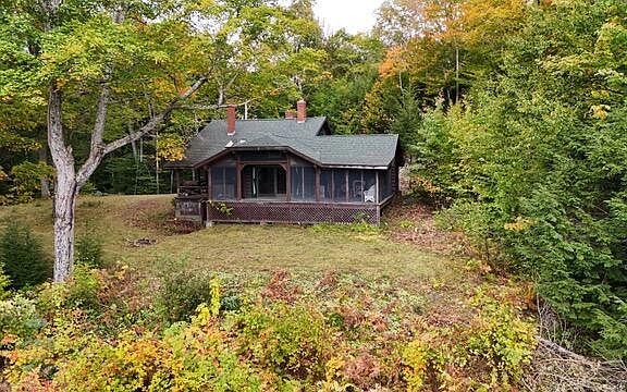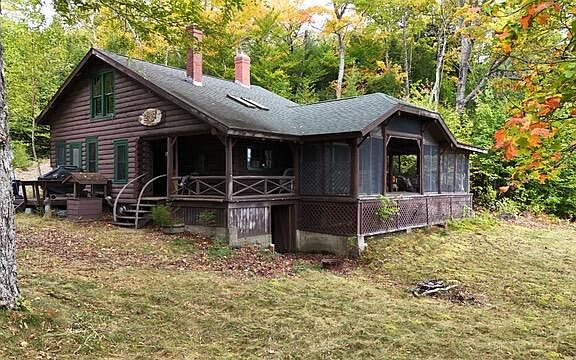 Rustic log cabin with 274' of waterfront on Upper Wilson Pond. A wrap around screened in porch stretches from the main entryway to the far side of the house with gorgeous mountain and lake views. Entering through the large sliding doors the main living area is centered around a beautiful fireplace with wood stove and side dining area and two bedrooms. Off of foyer you enter in to the kitchen with its own deck set up for summer time grilling, bathroom and stairway to the upstairs bunk room.