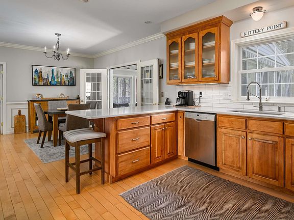 Sited on a well landscaped, 1.25 acre, lot in sought after Kittery Point, this immaculately maintained 3 bedroom cape is tucked away off of a private cul-de-sac. Recent updates include a new roof, new Anderson windows on the main level, a new well pump and water filtration system as well as a fresh coat of paint. This sprawling cape's first floor plan features a modern, updated eat-in kitchen with quartz counters, peninsula with bar-height seating, stainless appliances, a spacious living room with gas fireplace, an elegant dining room, a four season sunroom that has access to the rear deck and overlooks the backyard and a half bath with laundry hook-ups. Making single level living easy, the primary suite is also on this floor with a bath remodeled in 2022. Upstairs, the home offers two additional guest rooms, one has an office/flexible room connected to it. There is also a full bath and unfinished space above the garage which offers endless possibilities. The full, walk-out basement offers significant storage as well as in the oversized, attached two-car garage. This home's location is minutes to Kittery Foreside, Seapoint Beach, downtown Portsmouth, York and is a great commuter location.
