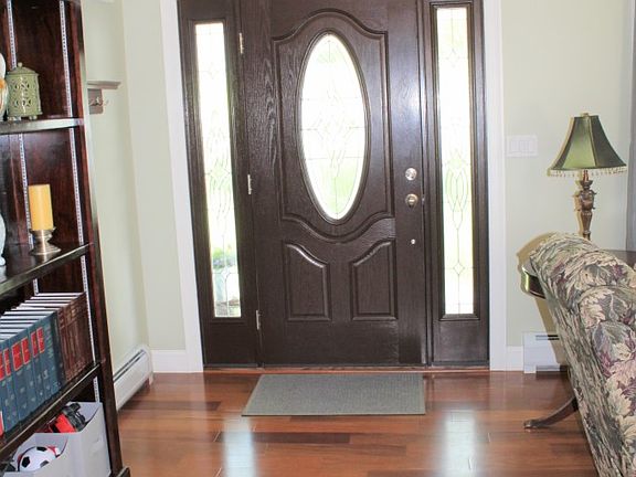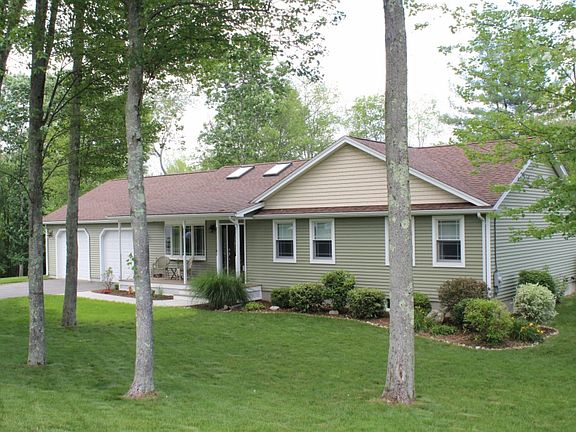 Pride of ownership shows throughout this lovely custom built Contemporary Ranch Style Home. Nicely situated on nearly an acre lot with stone walls, lush landscaping, garden area and a paved driveway. The front porch and concrete walkway make for an inviting entrance to the home. The living room offers a beautiful bay window, cathedral ceiling with 2 custom skylights that open & close remotely. Open Floor Plan, Brazilian Teak flooring, Large Country kitchen with lots of Cabinets,center island with bar sink and breakfast bar, stainless steel appliances, recessed and pendant lighting and a French door to the low maintenance deck that overlooks the back yard. Nice sized main bathroom with laundry area, tiled floor and upgraded cabinetry, 2 good sized bedrooms with wall to wall carpeting, ceiling fans and ample closet space. Master bedroom suite has wood flooring, closet with organizer and custom master bathroom with skylight, tiled floor, double vanity and tiled shower/Jacuzzi tub.