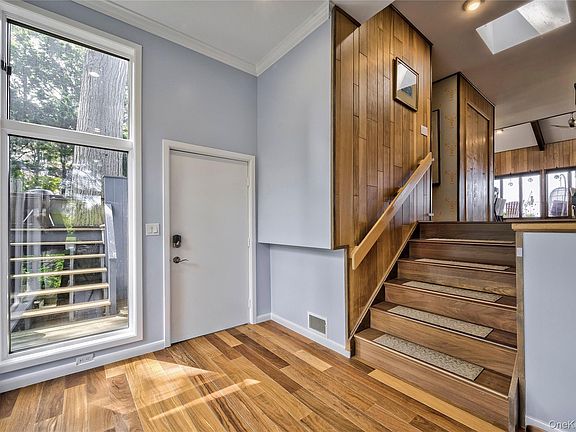Inside, the open floor plan and soaring ceilings create an airy, inviting atmosphere, while walls of windows flood the living spaces with natural light. The spacious living room and dining room, as well as the expansive deck are perfect for entertaining or simply enjoying quiet evenings with the water as your view. Mostly remodeled just a few years ago, the home features gleaming hardwood floors, a marble bath downstairs, a walk-in closet, motorized shades, a steam shower, carrera marble, a stunningly remodeled en suite primary bath, and skylights that add even more brightness to the interior. The kitchen is equipped with modern appliances added during the renovation, offering both style and functionality.