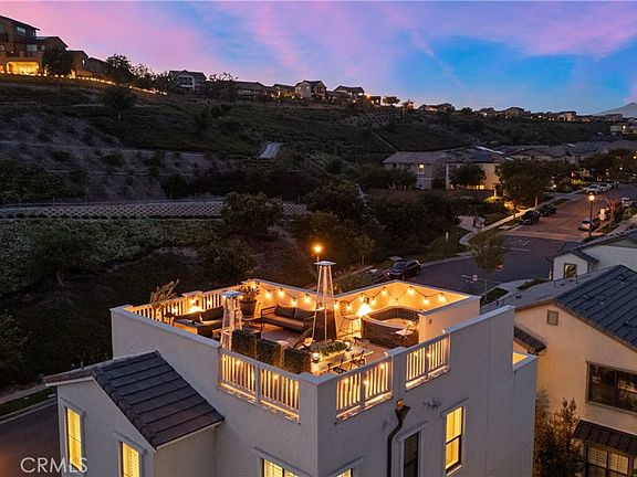 Presenting an exquisite residence boasting a captivating ROOFTOP VIEW DECK within the prestigious master-planned community of Esencia. Spanning nearly 2,000 square feet, this 4-bedroom abode, despite its new construction, showcases upgrades that epitomize elevated sophistication. Upon entry, one is greeted by a meticulously crafted shiplap foyer adorned with elegant chandelier lighting, a convenient storage closet, direct access to a 2-car garage, and a secluded en-suite bedroom with its own lavishly appointed bathroom. Ascend to the main level, where a designer office/den awaits, complete with bespoke built-in cabinets, plantation shutters, and custom wall coverings. Adjacent to the office, a powder room boasts further designer elements and custom fixtures. The grand open layout of the family room beckons with a custom feature TV wall clad in distressed shiplap wood, complemented by custom storage cabinets and windows equipped with remote-controlled automated privacy shades. This level also features an inviting dry bar, dining area, and a kitchen resplendent with floor-to-ceiling white shaker cabinets, herringbone backsplash, custom pendant lighting, and stainless steel appliances. Step out onto the main level's wraparound balcony through upgraded bifold doors and savor views facing West and North. On the upper level, discover the convenience of a side-by-side laundry closet alongside the primary suite, adorned with a custom accent wall, plantation shutters, and a generous walk-in closet. The pristine white master bathroom boasts black hardware accents, a double sink vanity, a soaking tub, and a separate shower. The pièce de résistance awaits as one steps onto the expansive rooftop deck, complete with a heated jacuzzi—an idyllic setting for summer soirées, BBQs, and unparalleled vistas of mountains, the picturesque community, and breathtaking sunsets. Moreover, relish in the abundant amenities offered by this Orange County enclave, including resort-style pools with fire pit and vista point, outdoor BBQ area with grills and pizza ovens, relaxing spas, a media room for activities and private parties, outdoor lounge with fireplace and TVs, clubhouse, gourmet kitchen with billiards and shuffleboard, fitness center with cardio and strength training equipment, Wi-Fi in all common areas, coffee shop, dog park, community bar, in-community schools, and even glamping. Embrace the opportunity to reside in perpetual vacation mode—welcome home!
