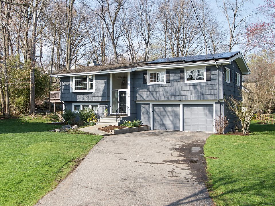 LOCATION on a double cul de sac! There is a total of 2726 square footage in this spacious 4/5 bedroom, 3 bathroom home near Mead Pond in the award winning Rye School District. The main floor features a vaulted ceiling living room, dining room and open concept kitchen with all new hardwood floors leading into a large Great Room w/wood burning stove. Large sun filled windows and wrap around deck surround this fabulous entertaining space. 1026 square feet on the completely renovated (2014) lower level includes a "man cave" den with gas fireplace, large bedroom, additional bedroom/gym/office, new bath with heated floors, laundry and utility room with built ins. Sun filled double French doors lead to garden. Window seat offers additional storage. Complete backyard privacy! Great savings with solar power support!