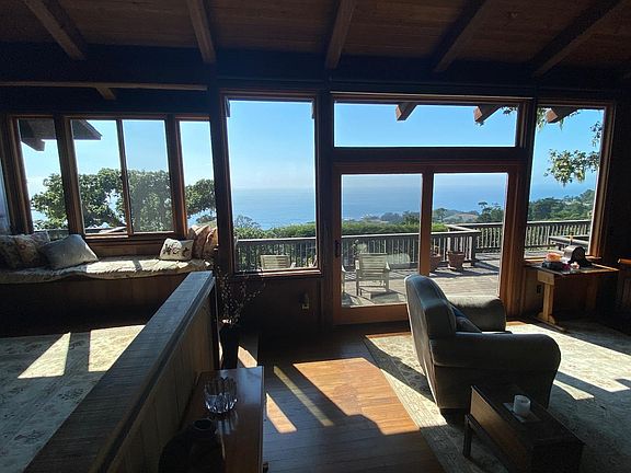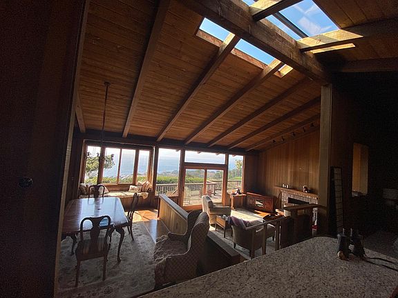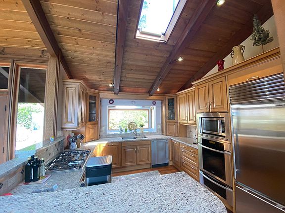 Spectacular ocean views from every room in this very private home on 1.6 acres. Rustic wood interior with modern features evokes feelings of warmth and comfort and presents an auro of timeless beauty. 2 bedrooms plus office/bedroom and 2 full bathrooms in the main house and studio with bathroom behind oversized 2 car garage. Modern kitchen with skylights, granite countertops Miele and SubZero appliances overlooks great room with fireplace, skylights at crest of high vaultred ceilings and the sparkling ocean beyond. Master retreat with fireplace surrounded by walls of built-in bookcases, skylights and slider to private ocean view deck. Master bathroom with high valuted ceiling, skylights, multiple closets, double sinks, oversized tub with ocean views. Separate ocean view unit with private entrance for guests, artist studio, wellness retreat, au pair etc. Oversized 2 car garage with electric car charging port. 2 Basement areas for wine and storage. Whole house generator. Needs a little TLC.