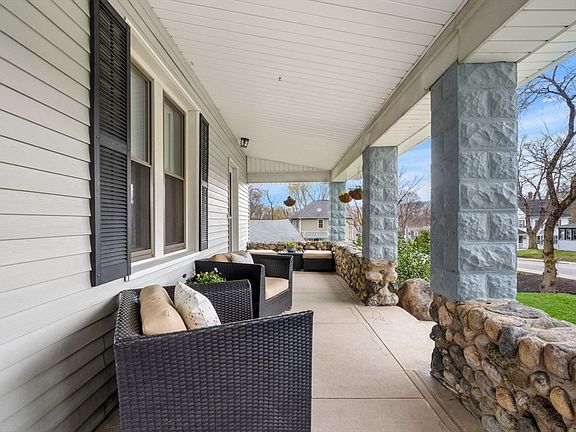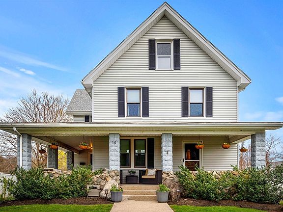 Welcome to 14 Merrimac St - a stately and handsome home replete with ornate details, character, and craftsmanship of a turn of the century home, but equipped with modern day updates! You will fall in love the moment you step onto the huge covered front porch beckoning you to have a seat and watch the world pass by with a cocktail or cup of coffee in hand. Inside you will be immediately struck by the stunning custom woodworking you will find throughout the home. The main level has a large living room, dining room with built in hutch, 1/2 bath and spacious galley kitchen. Upstairs you will find 3 large bedrooms with ample closet space, a cozy nook that makes a great office, full bath and access to your huge walk up attic (expansion potential!). Head to the basement to find a finished bonus room great for office, play room, etc. This home is perched high above Merrimac St on almost a 1/2 acre lot with an oversized detached 2 car garage (with second level that could be finished!).