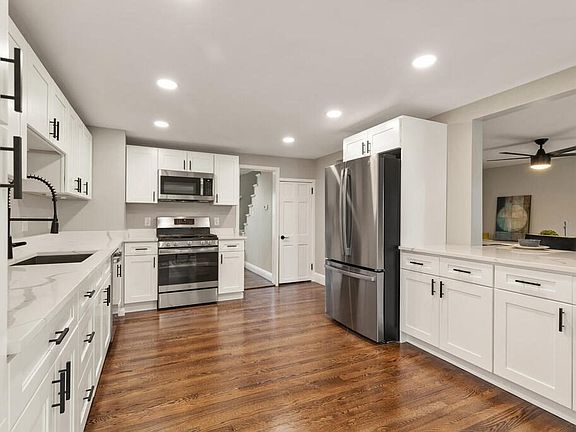 Classic 2,000 +- S/F 4-bedroom Gambrel Colonial in a popular Greenwood neighborhood location. 1st floor includes new gourmet kitchen with tons of white shaker style cabinets, all new appliances and gas stove. There are quartz counters, with a 2-seat breakfast bar open to both the family room and a light filled eating area. Enter a welcoming living room through the bright sun splashed front sunroom. The LR includes hardwood floors & gas fired "wood stove". Also on the 1st floor is a new full bathroom, den and a tucked away 1st floor bedroom. All new hardwood, laminate or wall to wall flooring throughout. 2nd floor has two staircases one to the large primary with a cathedral ceiling. Plus two additional 2nd floor bedrooms, an office and updated 3/4 bath, all freshly painted. New roof, updated plumbing & electrical. 2 gas heat and central air units. Fenced corner lot. Plenty of room for large or extended families. A couple blocks to Main St., with shopping, restaurants and transportation.
