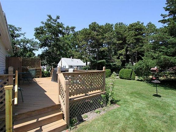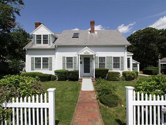 Location! Charm! Walk to Harwich Port Village and Nantucket Sound beaches! Bright, cheerful, airy home with newer windows, hardwood floors, nice appliances, first floor laundry. Kitchen with lovely wood cabinets and beamed ceiling, opening to deck and dining area with box bay window & breakfast bar. Pretty hardwood floors. Fabulous, sunny living room with raised hearth fireplace and corner bookshelves. Spacious first floor bedroom with raised windows over headboard and walk-in closet. Full bath with skylight. Turned stairway leads to second floor with open center hall & skylight...two charming bedrooms, plus a den/office and full bath. Basement with partial crawl space. New 4 BR septic system will be installed prior to closing. Pretty yard. Outdoor shower. Picturesque, detached one car garage. A Harwich Port Treasure!