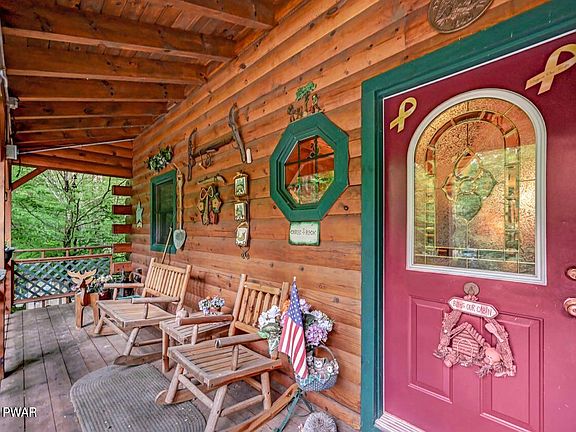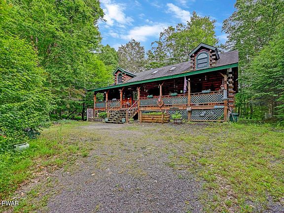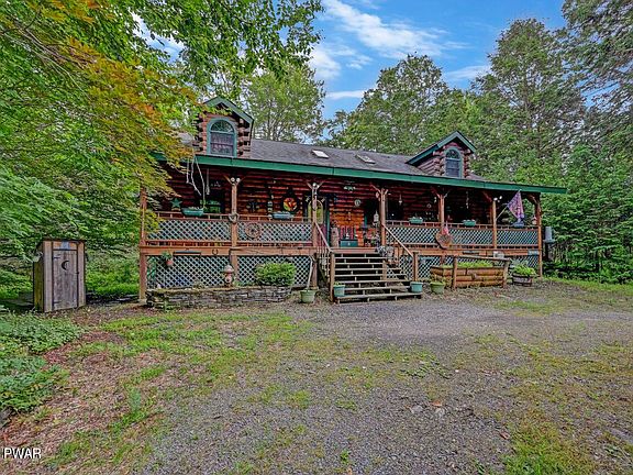 A true log home located on a completely private, wooded property in The Hideout, a four-season amenity filled community in The Northern Poconos. Nestled on a secluded wooded lot, this stunning log home offers the ultimate in privacy and tranquility. A circular driveway leads to a charming, covered front porch, perfect for relaxing and enjoying the natural surroundings. Inside, you'll find spacious rooms throughout, an open floor plan, and soaring high ceilings that create a bright and airy atmosphere.The main level features a cozy primary bedroom with an en-suite bathroom and a large laundry room for added convenience. Upstairs, a generous loft area complements two additional bedrooms with vaulted ceilings and dormer windows, all adorned with beautiful knotty pine ceilings. The expansive unfinished lower level provides ample opportunity for future expansion or customization. Step outside to the large rear deck, where a covered section offers a perfect spot for outdoor dining or entertaining. This home combines rustic charm with modern comforts, making it an ideal retreat.