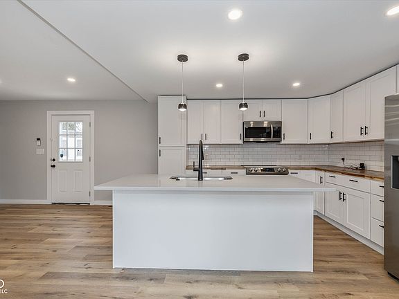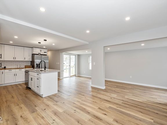 Stylish backsplashThree bedroomsShaker cabinetsDedicated laundry roomLarge kitchen islandOpen floor plan