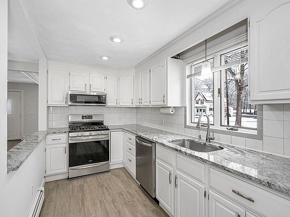 Adorable & lovingly maintained home located in a neighborhood setting close to Route 93! This true New England charmer wraps you in warmth as soon as you enter. The 1st floor offers a spacious living room with laminate flooring that leads to an open kitchen & dining area. The immaculate kitchen features cabinetry with a fresh look, granite countertops & updated stainless steel appliances. The 1st full bathroom is completely updated with tile floor, sink & updated fixtures throughout. 1st floor bedroom with walk-in closet is a big plus! The 2nd level features 2 decent sized bedrooms with closets & recessed lighting. Finished lower level with play room & exercise room with updated laundry and ¾ bath. Plenty of off street parking, partially fenced in yard with patio, natural gas heat & hot water, front farmer’s porch & nice property curb appeal. Easy highway access, close to all amenities, public schools & more.