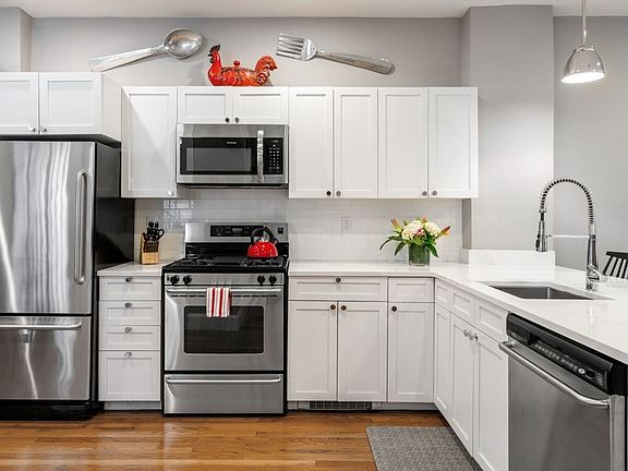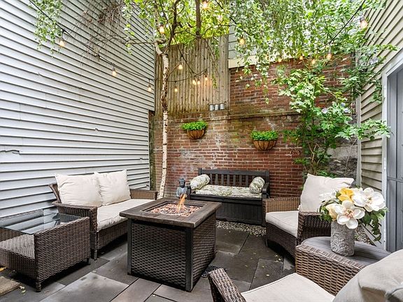 This spectacular, 2+BR/2BA, 1300sf, duplex condo lives large with tall ceilings, an open layout, and warm and inviting outdoor oasis, which includes a living, dining and bar area with gas fire pit – perfect for entertaining through three seasons. A beautiful birch tree and Rose of Sharon canopy over the patio, highlighted with strings of lights, providing privacy and ambiance. Three sets of French doors provide access to the patio, allowing for great connectivity to the outdoor space. The chef’s kitchen is open to the living and dining areas and features white shaker cabinetry, subway tile backsplash, stainless appliances, and quartz countertops w/bar seating. A guest bedroom and full bath complete this level w/direct egress to the private patio. The lower level features a primary bedroom with en-suite bathroom, office/den, laundry center and storage/utility. Amenities: C/Air, hardwood floors, rental parking secured nearby and great proximity to transportation, shops and restaurants