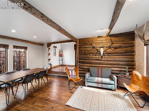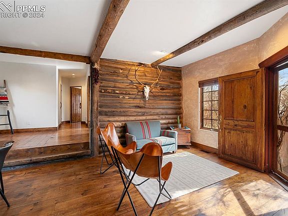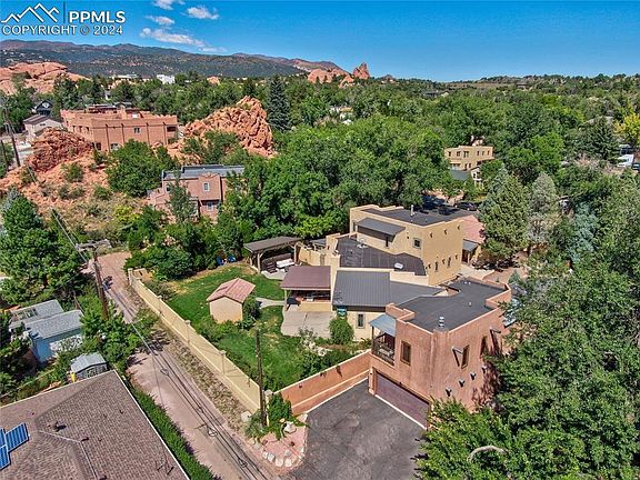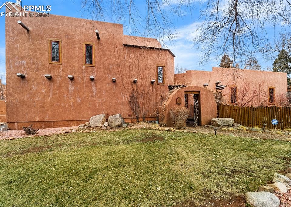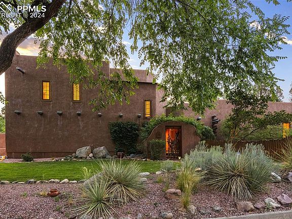 This house is SO cool showcasing exquisite Santa Fe architecture and design with 2 bedrooms + 1 Office +2 bathrooms +2 car garage with a huge master suite, Approximately 1600 sq ft total. Cassio brilliantly designed and built this custom stunner with unmatched quality, eye catching design and high end finishes. The main level features all wood floors, wood beams, log walls, 1 bedroom with access to the patio, 1 full bathroom, 1 office that can function as a 3rd bedroom , open living room and dining room and kitchen with laundry right off the garage. The upper level is an entire master suite with kiva fireplace, sitting area, wood beams, open bathroom, 2 balconies and mountain/red rock views. Enjoy Summer with newer AC. The yard has been artfully designed with a custom fence, easy to care for grass and low maintenance plants that bring out all the colors of a super bloom without the maintenance. The two car garage has been finished with upgraded electrical for EVs. The location is everything Colorado Springs offers with mountain and rock views, easy access to Garden of The Gods, Red Rocks Open Space, the highways to commute, OCC and Manitou. Engineer gave the OK for the roof to accommodate a roof top deck which would provide 360 degree views and Pikes Peak staring right at you. The artistic details and architectural design are even better in person, so come see this cool house today.