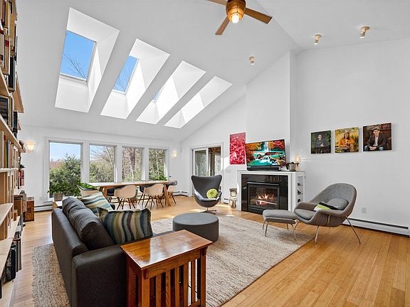 Easy quiet & serene living in the mountains of Vermont! Well-designed one-level living within minutes to Waterbury & Stowe Vermont. An easy 25 minutes to Burlington. The architectural vaulted great room brings in natural light with skylights and a wall of windows facing the mountain view. The gas fireplace and terrific locally crafted high-quality bookshelves complete the space. A spacious kitchen with quartz counters, spacious island for cooking and eating, glass cabinets and counter space perfect for a coffee station, and a windowed alcove good for a loveseat or breakfast table. Walk out to the backyard to the large patio area facing the view. Currently, the owner is using the dining room for a splendid office. The dining area is in the great room to capture the view. A new heated four season porch faces the view. The bedroom wing has a private main bedroom suite with walk-out private covered deck, gas stove, double vanity sink, walk-in closet, tiled shower, and a soaking tub perfectly positioned to view nature. Three additional bedrooms and full bathroom. One bedroom features a built-in desk system and covered walk-out deck. The large laundry room with sink and counter space is a treat! The oversized two-car garage has a ton of overhead storage. Walk for miles throughout Pinnacle South trails. Snowshoe through hemlock & pine forest. Grab your kayaks and paddle on the Waterbury Reservoir only five minutes away. This is a special Vermont lifestyle!