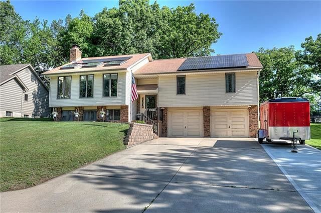 Quiet neighborhood yet just minutes from everything. Nice open kitchen w/ an island & lots of cabinets. Check out their electric bill. Averages $50/month due to solar panels on the roof. Extra energy produced is sold back to KCP&L. New carpet on main level. 4th non-conforming bedroom in basement has its own bath attached. Entertaining will be easy at the 14' long wet bar in the family room. 10x12 storage shed w/ concrete floor.