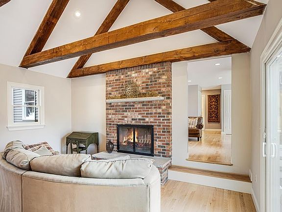 Are you looking for a beautifully updated Colonial with tons of character and room for everyone? Cozy up on winter evenings by the double sided fireplace in the Family Room complete with beamed cathedral ceilings, barn door covering excellent storage space, and slider to back deck. Host family and friends in the open concept eat-in Kitchen/Living/Dining Room. First floor den with closet and full bath. Second level features Master Bedroom Suite with private bath, complete with double vanity and walk in closet, plus two bedrooms and a laundry room. Continue up the staircase to the stunningly finished attic space with built in shelving which is perfect for a playroom or a guest suite. The large room over the garage with full bath and separate entrance is perfect for au pair suite, or home office/business. Deck with double sliders and fenced in backyard, hardwood floors throughout, kitchen pantry & high ceilings. Located with easy access to highway, commuter rail and schools, a rare find!