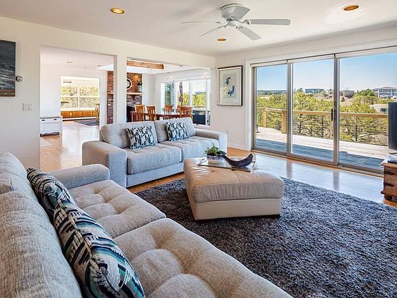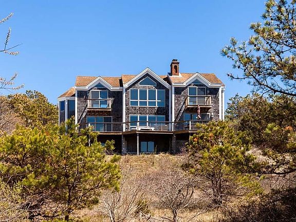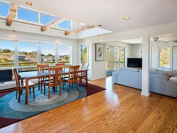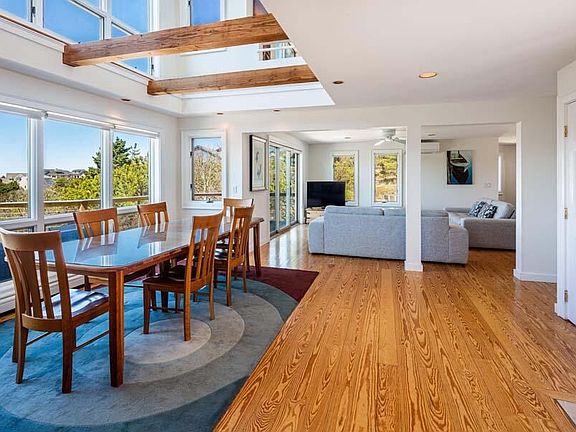 Stunning Waterview Home! Enjoy views, sunsets and privacy from this spacious three-level home that is just a short walk to Great Hollow Beach. The open concept main level features a living room, dining room and kitchen; a perfect layout for indoor or outdoor entertaining with sliders leading to an expansive deck. The eat-in kitchen has an island, granite counters and stainless appliances while the dining room has a wood-burning fireplace and a dramatic two-story bank of windows. Drenched in light, the upstairs features cathedral ceilings and views of Cape Cod Bay to Provincetown. On this level is a second living room with sliders leading to two decks and a large primary bedroom with a fireplace and two more decks to relax or take in the views. The primary bath features a double vanity with granite, tiled walk-in shower and a separate tub. This well-designed home has gleaming hardwood floors throughout, three additional bedrooms, an outdoor shower and a two-car detached garage with a bonus space below that would make an ideal workshop or artist studio. Perfect for year-round or investment, this home is being offered furnished with few exceptions. There is a strong weekly rental