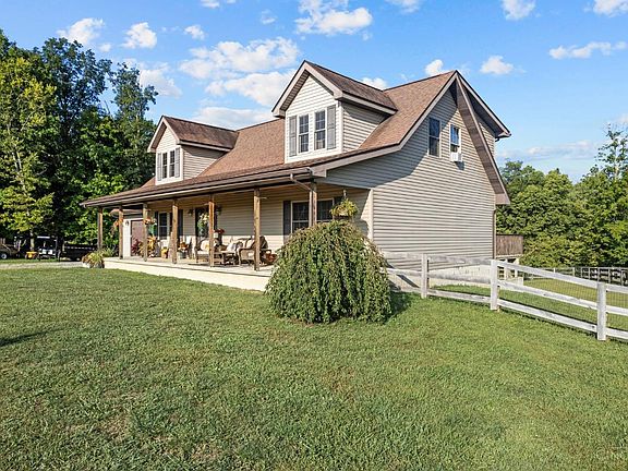 Step into the serene, peaceful atmosphere of this cozy Cape Cod-style home. As soon as you enter, you'll be captivated by the stunning two-story stone fireplace, vaulted ceilings, and the inviting open-concept floor plan. The first-floor primary bedroom features an en suite bathroom, a walk-in closet, and elegant tray ceilings. The full, unfinished walkout basement offers endless potential, while the over-sized two-car attached garage includes a home office above. Enjoy breathtaking views from both the front and back porches, overlooking open fields and peaceful river scenes. Don't miss out on this one-of-a-kind property that truly has it all.