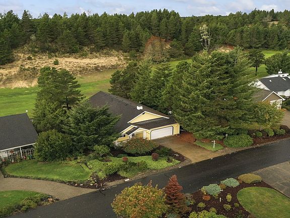 Delightful single story home in Ocean Dunes Estates, on the golf course. Three bedroom plus a den home being sold by original owner. Open living and dining area with deck off of both. Fireplace in living room. Kitchen with breakfast bar open to living area. Primary room with own deck access, walk-in closet, step in shower and dual sinks. Den with built in bookshelves perfect for your library collection. Unfinished basement. Views of golf course, dunes and trees with magnificent sunsets.