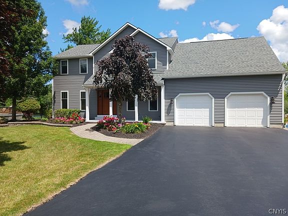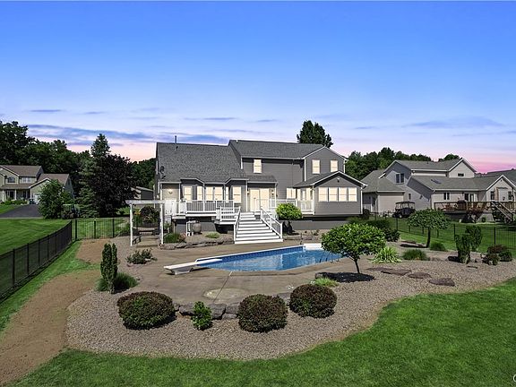 Stunning river front home on Oneida River - what a gem and rare find! Spend your days in your own resort like backyard with oversized composite deck that leads you to a LED lit in ground pool; enclosed 3 season room with hot tub; fully fenced in yard, along with a 102 ft. of waterfront with an 80 ft. 2 tier composite dock that leads you to deep water. Perfect for any size watercraft. This 4 bedroom retreat only has 11 neighboring homes on the river and is located on a dead end street offers both tranquility and exclusivity. Has it all, from hardwoods to spacious rooms. Upgraded kitchen and most appliances brand new. There are so many updates to list. In 2024 all 3 bathrooms were totally remodeled, pump and pool filter, electrical, lighting and fixtures, epoxy floor in 2 car garage, entire home painted and landscaped. Newer roof, AC, furnace, siding and windows. Conveniently located 3 miles North of Route 31 - very close to Great Northern Mall, restaurants, shopping and major roads. Just under 20 minutes to downtown Syracuse., This is a must see! There is a NYS Canal Corp. annual charge of $50 for waterfront homes and $50 for having a dock - application is in disclosures.